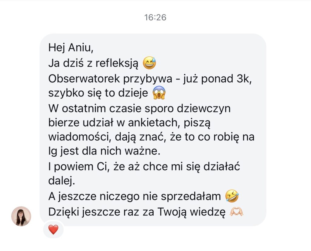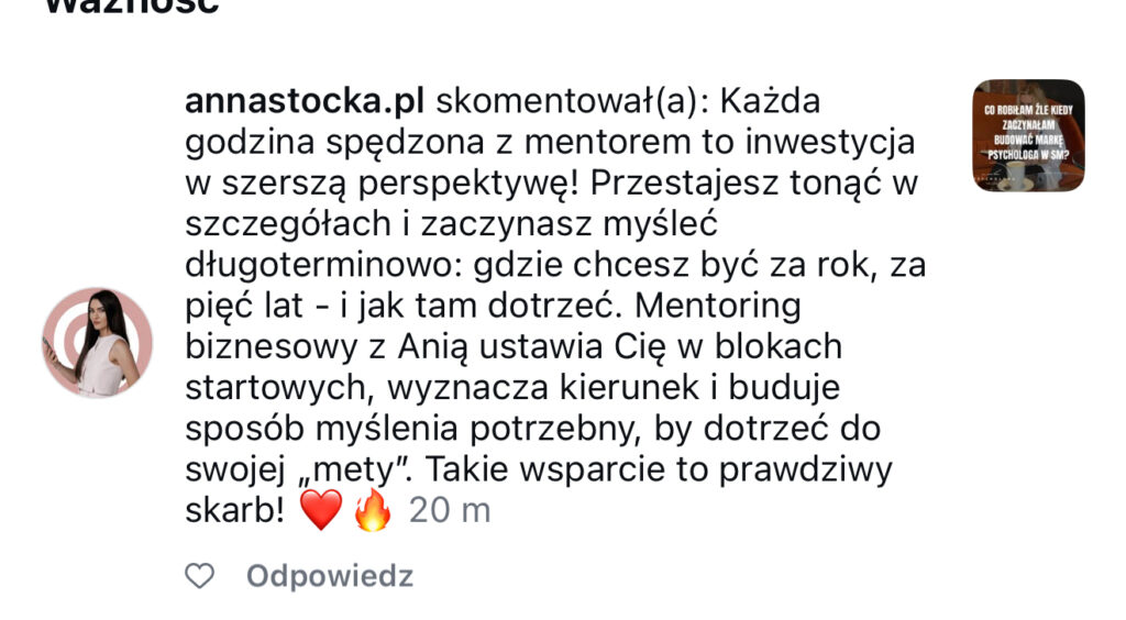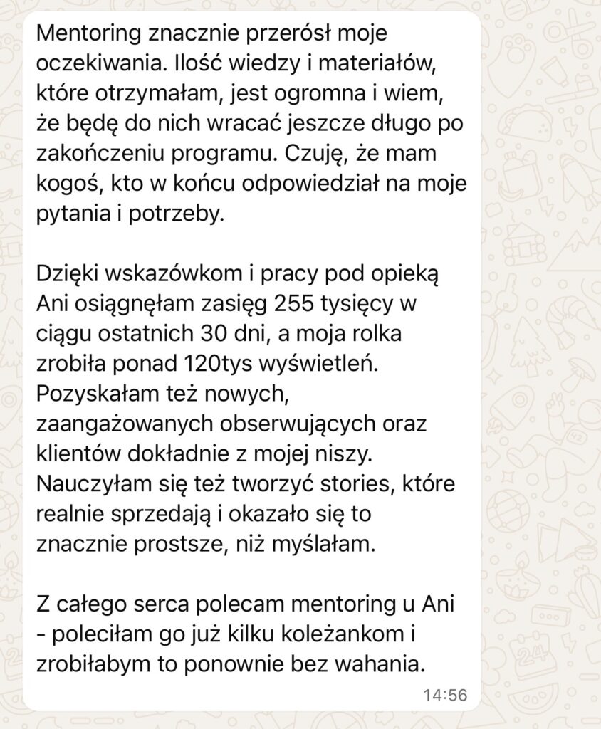 Pomyśl o tym inaczej: to równowartość kilku lub kilkunastu Twoich sesji 1:1. Jeśli dzięki mentoringowi sprzedasz swój pierwszy kurs dla 20 osób albo zapełnisz grafik na miesiące do przodu, inwestycja zwróci Ci się z nawiązką bardzo szybko. Kupujesz nie tylko wiedzę, ale lata moich błędów, za które ja już zapłaciłam.