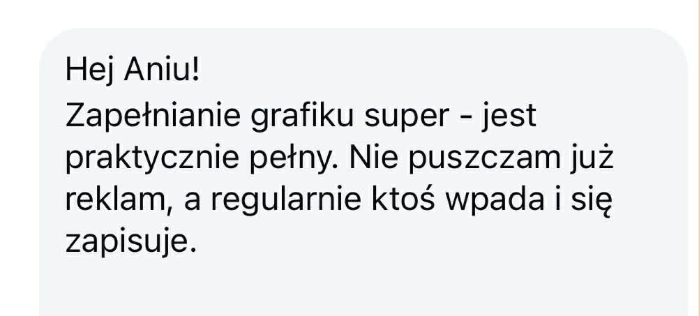 Koniec z nerwowym sprawdzaniem grafiku i martwieniem się odwołanymi wizytami. Wprowadzimy proste schematy komunikacji w social mediach, dzięki którym zaczniesz przyciągać ludzi, którzy potrzebują właśnie Twojej pomocy. Dowiesz się, co i jak pisać, żeby budować zaufanie bez „sprzedażowego” nacisku.
