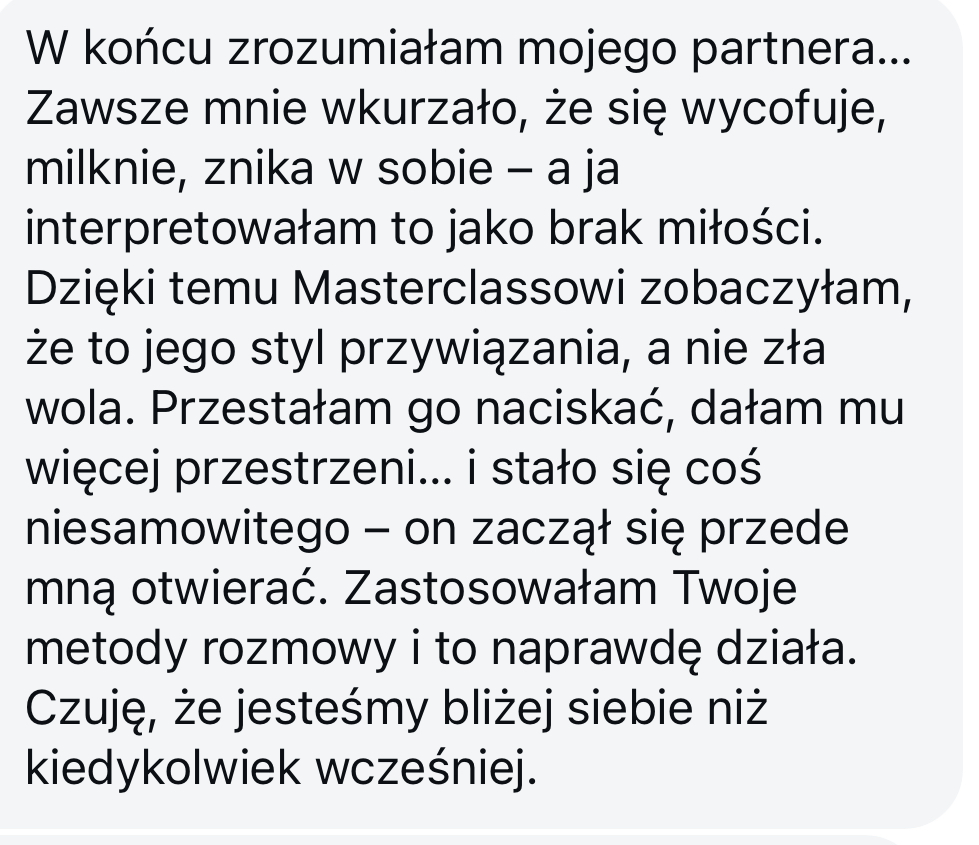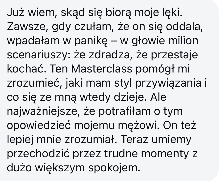 W tym masterclass dzielę się nie tylko moją wiedzą psychoterapeutyczną, ale także narzędziami, które realnie pomagają zatrzymać ten schemat i zacząć tworzyć relacje oparte na zdrowiu, wzajemności i szacunku.